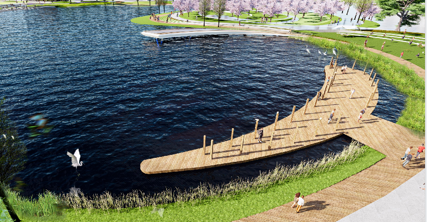 项目建成后,将呈现景观桥、景观挑台、浮桥码头、景观栈道等景观结构,配套有喷泉、休憩场地、特色景墙、儿童娱乐场所、休憩驿站、亲水平台、跑道等设施。