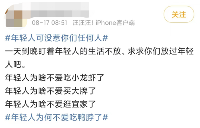 随着类似话题越来越多,很多与年轻人无关的标签,被硬生生贴了上去。比如,“为什么年轻人抵触体检”,其实体检焦虑是一种常见的情绪反应,也会发生在其他群体身上。再如,“为什么年轻人不爱吃鸭脖”,话题讨论集中在产品质量和口感等方面,和年轻人毫不相关。