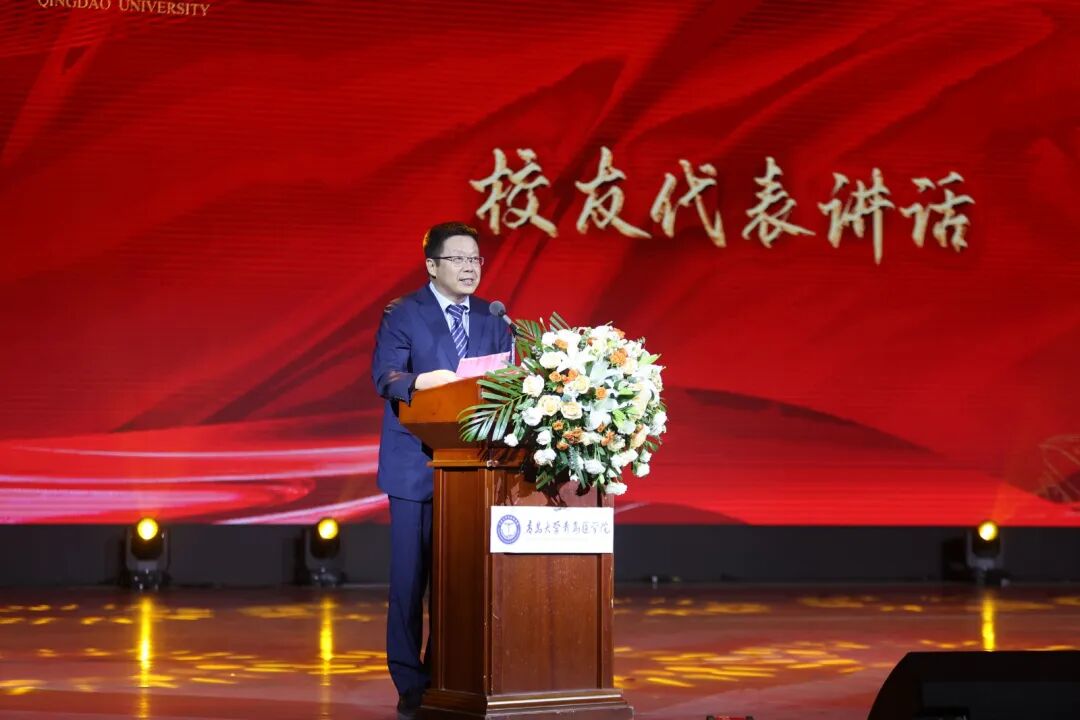 青岛医学院1984届校友、泰山学者攀登专家、博士生导师、2021年及2023年中国工程院院士有效候选人、原青岛大学附属医院院长、青岛大学医疗集团总院长董蒨教授作为校友代表上台发言。他回忆自己的大学生活,讲述自己的工作经历并对新生提出殷切期望:一要牢记使命,在学习中追求卓越;二要培养团队精神与人际关系;三要与时俱进,适应新时代的要求。他祝愿每一位同学在青岛医学院的学习旅程中取得丰硕的成果,成为一名优秀的医学工作者。