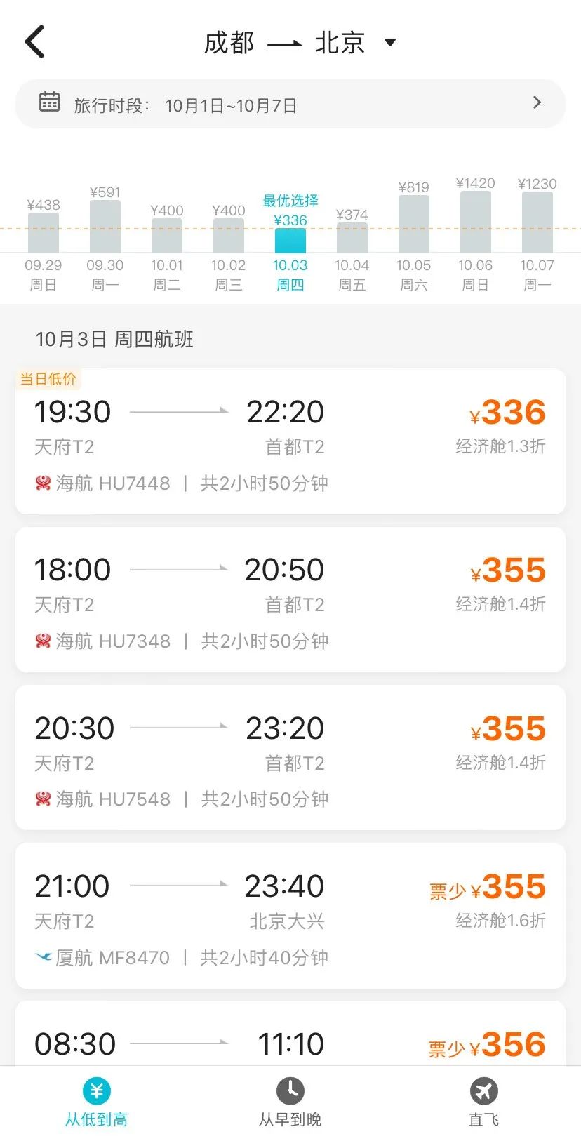 在某出行平台上,记者看到不少热门城市往返航班均出现不同程度的折扣。譬如10月3日成都飞往北京的航班,最低1.3折。