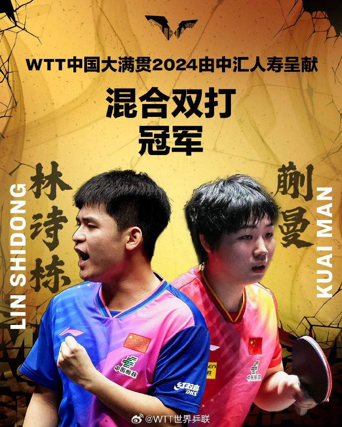 10月4日晚,在北京首钢园进行的WTT世界乒联中国大满贯混双决赛中,中国队组合林诗栋/蒯曼以3-1战胜队友林高远/王艺迪,夺得冠军。国乒包揽本次赛事混双项目冠亚军,恭喜!