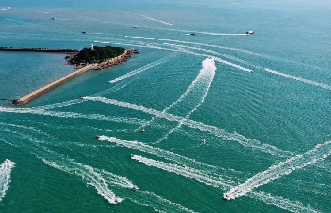 小青岛附近游船以海为纸,画出美丽线条 王雷 摄