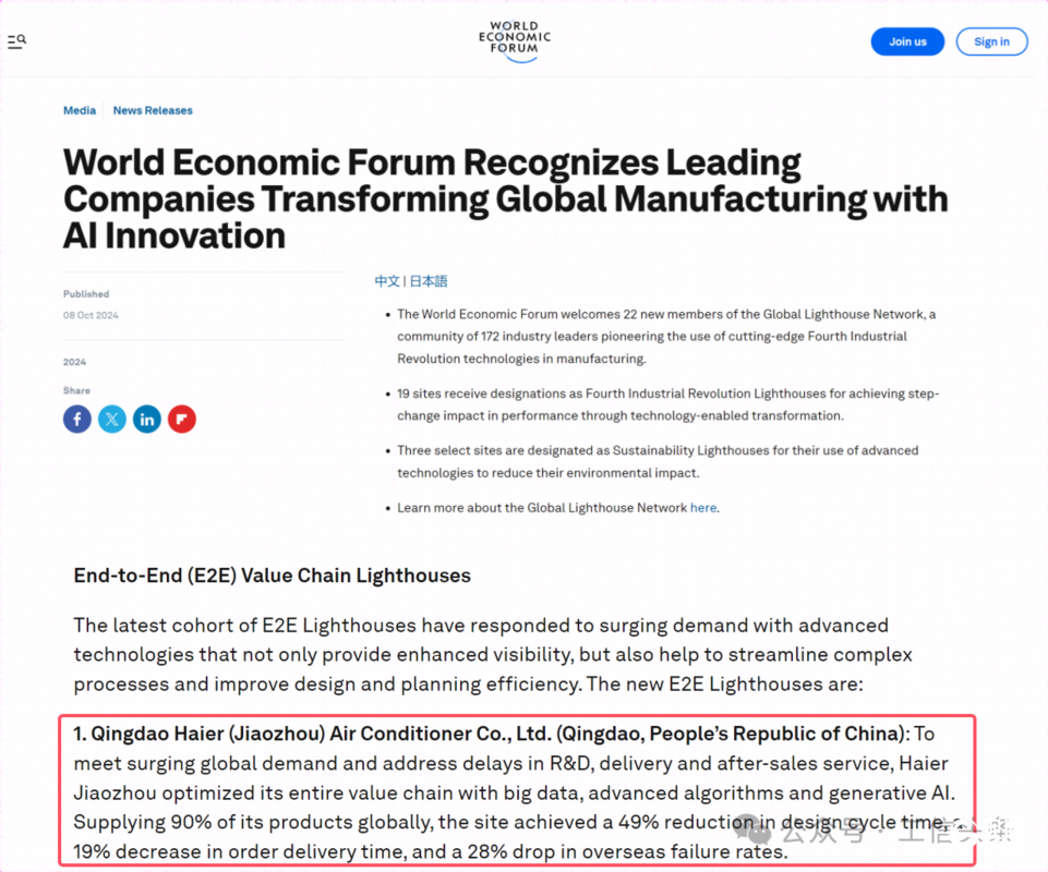 青岛日报社/观海新闻10月8日讯 世界经济论坛公布第12批灯塔工厂入选名单,22家新灯塔工厂入选灯塔网络,全球灯塔数量升至172家。在卡奥斯COSMOPlat工业互联网平台领先科技加持下,海尔胶州空调互联工厂成功入选,获评端到端(E2E)价值链灯塔工厂,成为本批次端到端灯塔工厂的唯一中国本土企业。