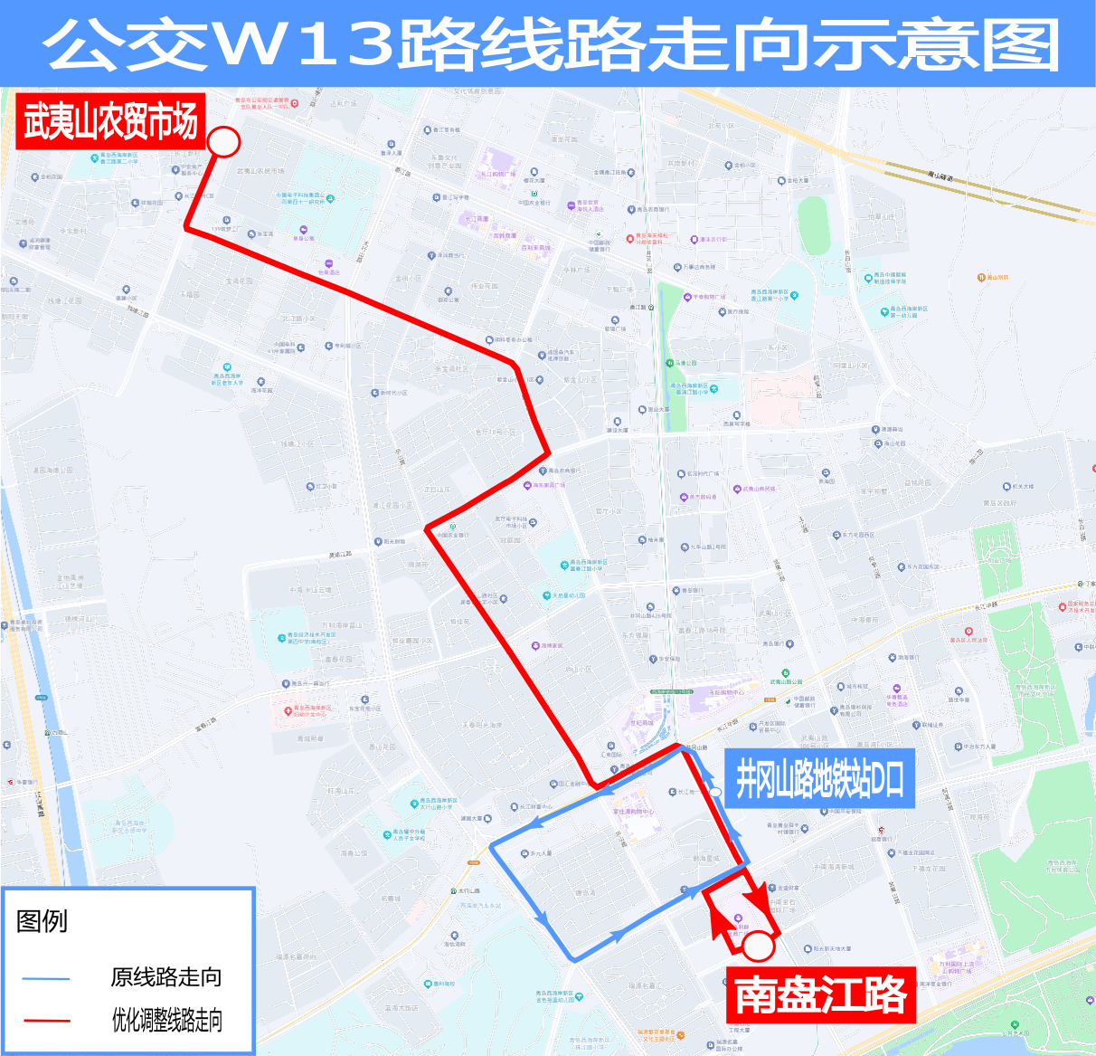 调整后线路:由南盘江路站发车,经南盘江路、金鼎山路、井冈山路、长江中路、庐山路、黄浦江路、紫金山路、北江路、五台山路到达武夷山农贸市场;回程由武夷山农贸市场站发车,经五台山路、北江路、紫金山路、黄埔江路、庐山路、长江中路、井冈山路、南盘江路到达南盘江路站。