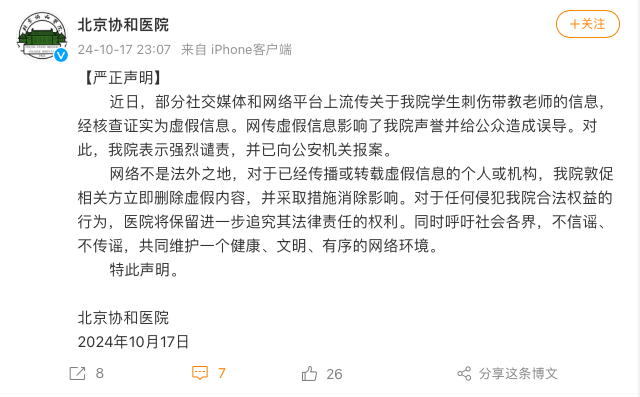 10月17日,北京协和医院发布声明称,网传学生刺伤带教老师为虚假信息,已向公安机关报案。以下是声明全文。