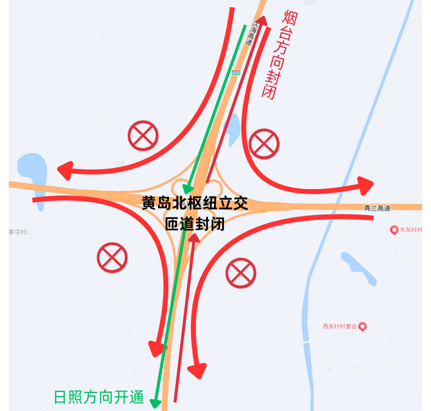 ①沈海高速黄岛北枢纽立交(G22青兰高速公路)现通行的所有匝道封闭②G15沈海高速烟台转向青岛、烟台转向济南方向;G22青兰高速青岛转向日照方向、济南转向日照方向,封闭路段不可驶入。