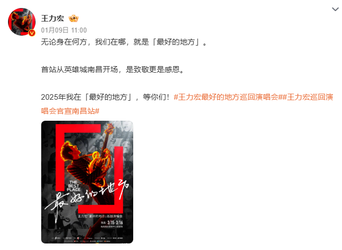 2025年1月9日,王力宏官宣巡演首站为南昌。