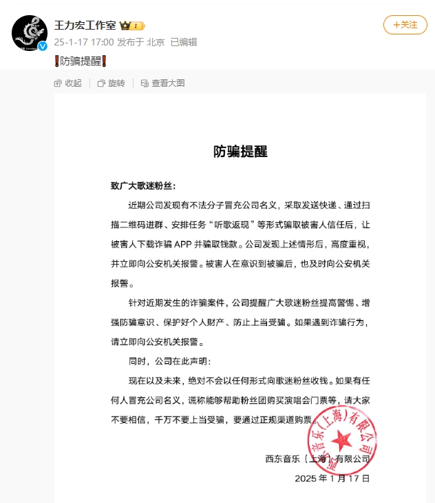 1月17日,歌手王力宏工作室发布防骗提醒,称近期有不法分子冒充公司名义,采取发送快递、通过扫二维码进群、安排任务“听歌返现”等形式骗取被害人信任,诱导被害人下载诈骗App并骗取钱款,公司已向公安机关报警。