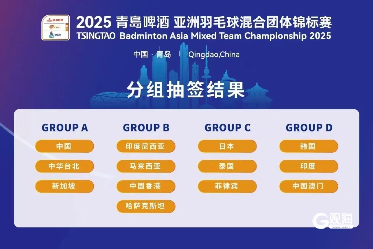 青岛日报社/观海新闻1月18日讯 2025青岛啤酒亚洲羽毛球混合团体锦标赛将于2月11至16日在青岛国信体育馆举行。1月17日,赛事分组签表出炉,东道主中国队与中国台北队,新加坡队同在A组。