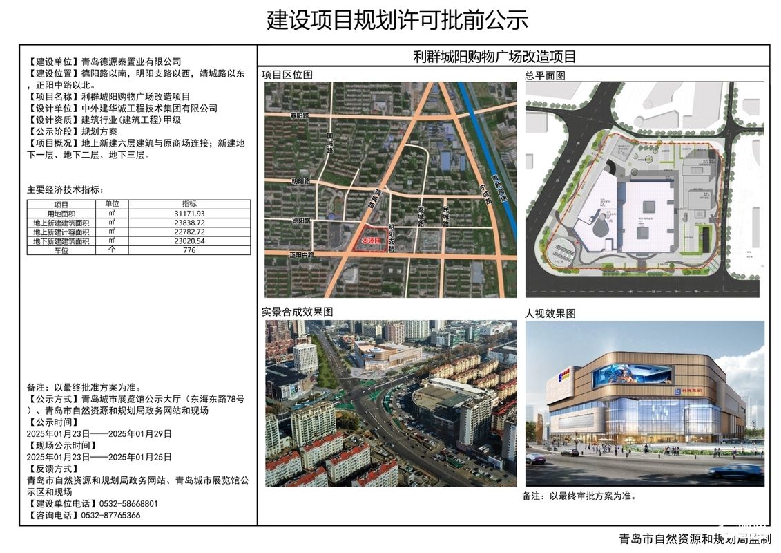 青岛日报社/观海新闻1月24日讯 近日,利群城阳购物广场改造项目规划方案批前公示,项目位于德阳路以南、明阳支路以西、靖城路以东、正阳中路以北,由青岛德源泰置业有限公司建设。根据公示,此次利群城阳购物广场改造,地上新建六层建筑与原商场连接;新建地下一层、地下二层、地下三层。