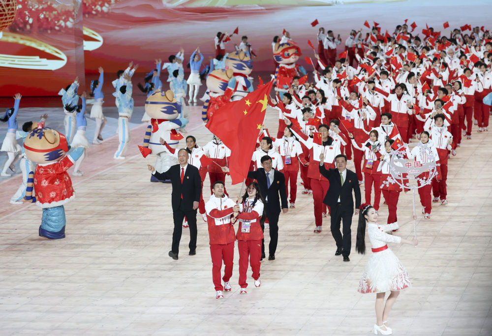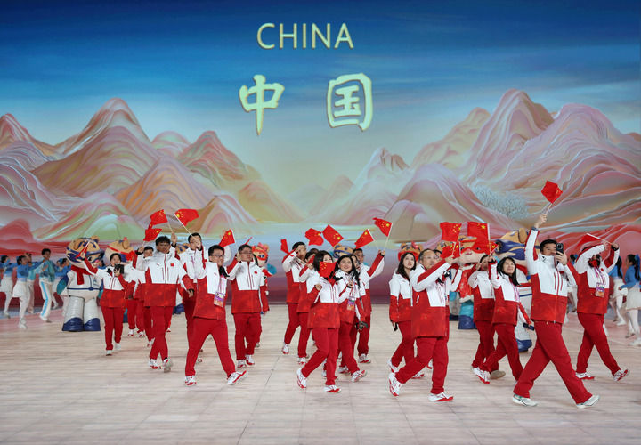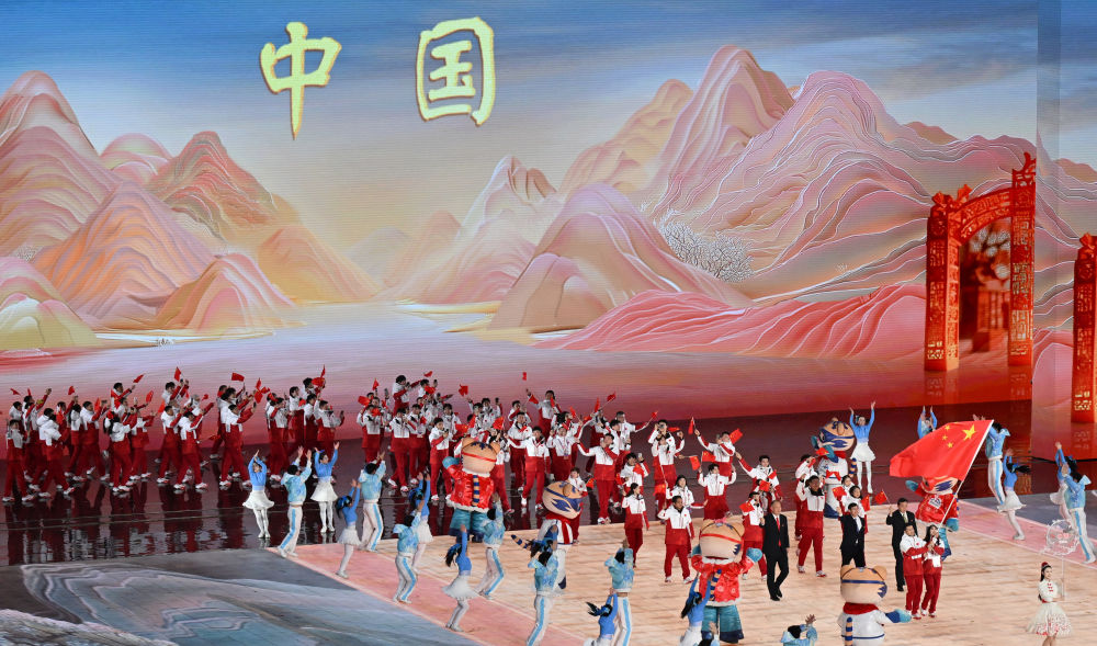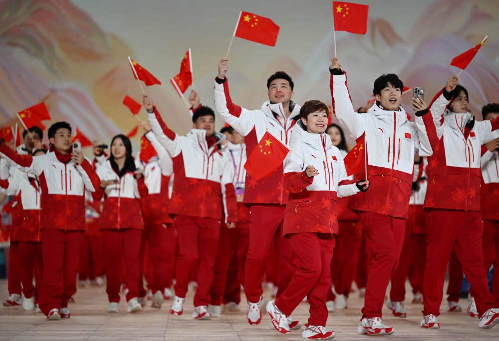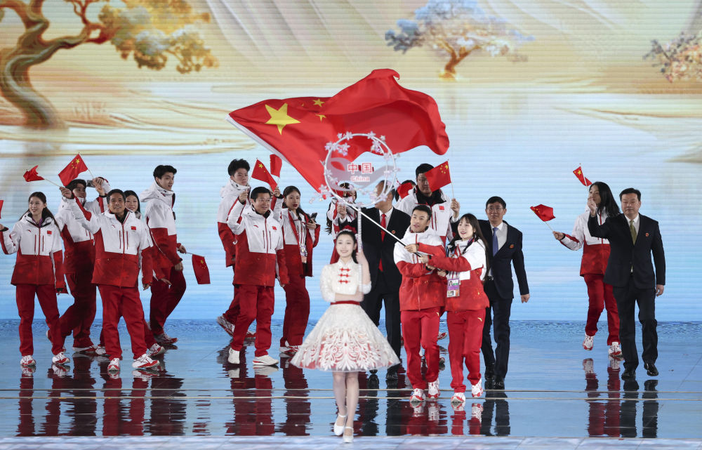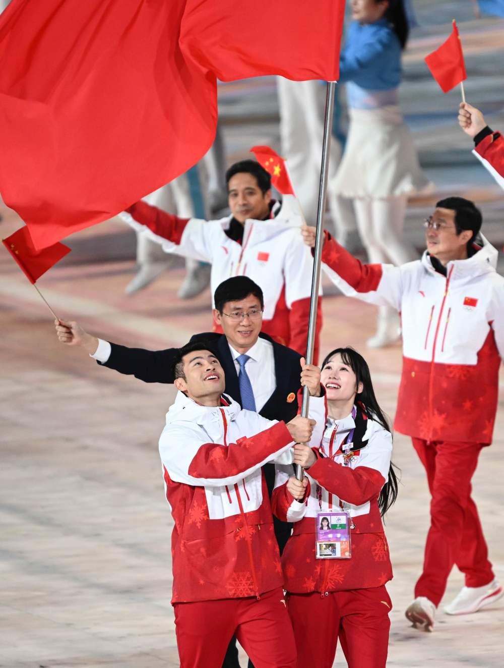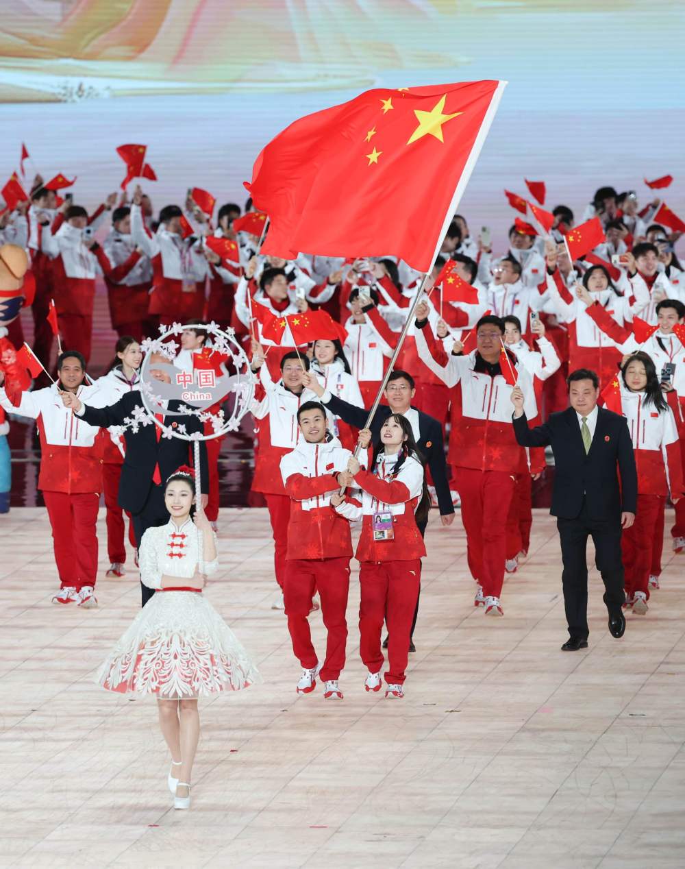 第九届亚洲冬季运动会开幕式 2月7日晚在哈尔滨举行 男子速度滑冰运动员宁忠岩 和女子滑雪运动员刘梦婷 执五星红旗 率中国体育代表团入场 “中国红”让全场气氛沸腾! 记者:王建威 黄伟 陈益宸 杨磊 谢剑飞 李紫恒 陈振海 责任编辑:王逸群 0