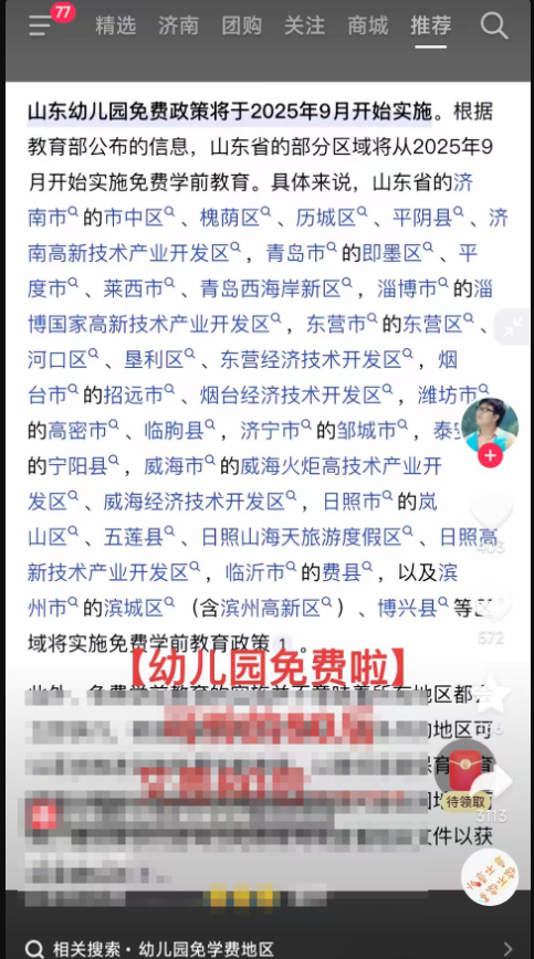 近日,“山东省的部分区域将从2025年9月开始实施免费学前教育”在多个短视频及社交平台流传,引发网友广泛关注。网传信息多以“教育部公布的消息”为开头,称山东省的部分区域将从2025年9月开始实施免费学前教育。