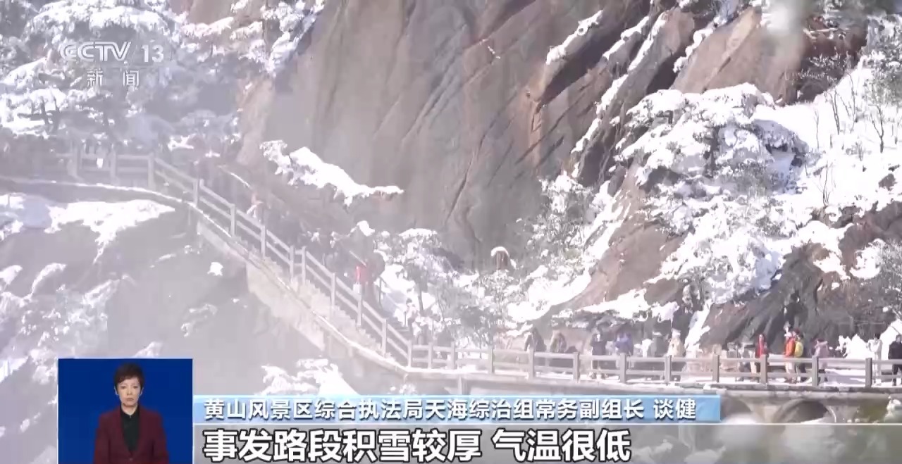 黄山风景区综合执法局天海综治组常务副组长 谈健:景区自2月17日以来持续出现降雪天气,事发路段积雪较厚、气温很低,环卫工人虽不间断铲雪除冰,但反复上冻,给通行带来不便。