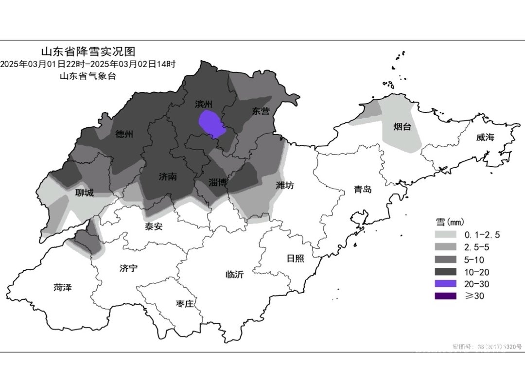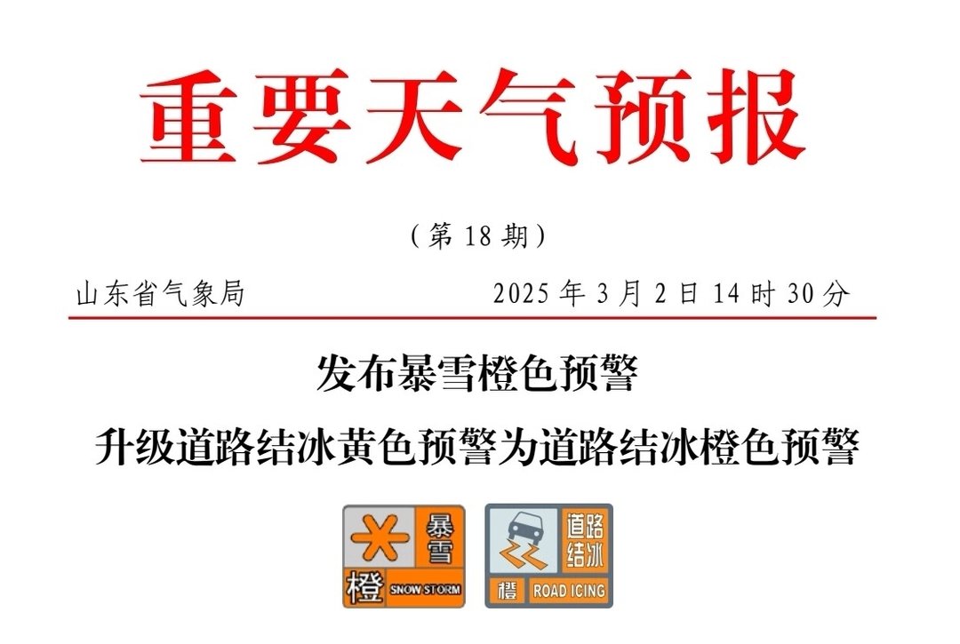 山东省气象台于3月2日14时30分发布暴雪橙色预警并将道路结冰黄色预警升级为道路结冰橙色预警:目前我省中北部地区已出现明显降雪和积雪,预计2日下午,降雪仍将持续,菏泽北部、聊城南部、鲁中和半岛北部地区有大到暴雪,聊城北部、德州、滨州和东营有小到中雪,其他地区有中雨转雨夹雪,菏泽、济宁、鲁西北、鲁中和半岛北部地区将出现对交通有较大影响的道路结冰。
