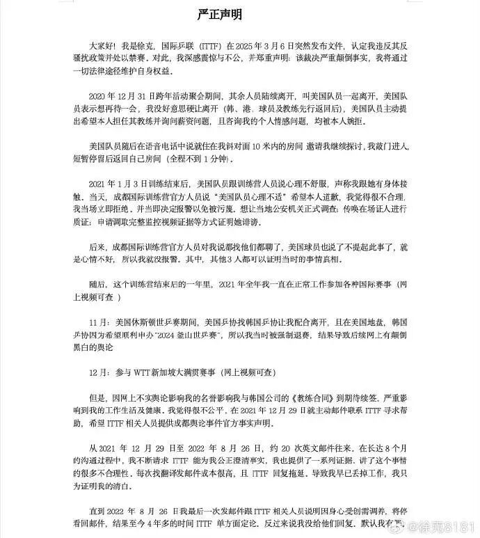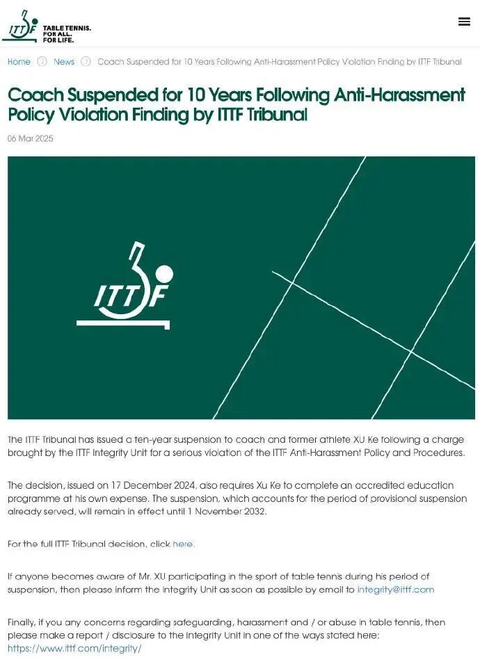 国际乒联称:“国际乒联诚信部门指控教练兼前运动员XU KE严重违反国际乒联反骚扰政策和程序,国际乒联对此处以10年禁赛处罚。该决定于2024年12月17日发布,还要求XU KE自费完成认证教育计划。暂停计算已服完的临时暂停期,将一直有效到2032年11月1日。”