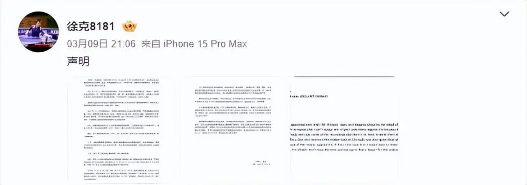 3月9日,因涉嫌性骚扰被禁赛10年的乒乓球教练、田志希丈夫徐克发布声明,称之前的裁决严重颠倒事实。