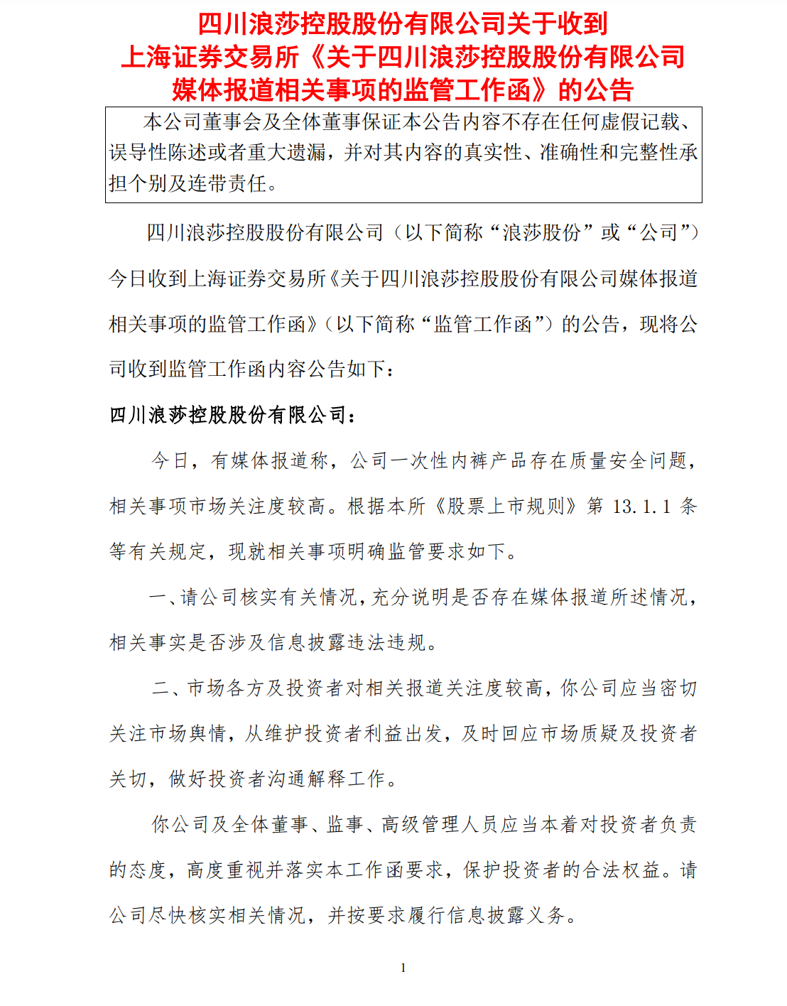 ▶ 浪莎股份:正积极配合当地市场监管部门核实相关事项