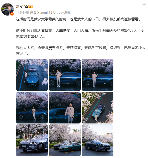 雷军发文:“这段时间是武汉大学最美的时刻,也是武大人的节日,很多校友都会返校看看。这个时候到武大看樱花,人非常多,人山人海。听说平时每天预约限额2万人,周末预约限额4万人。”