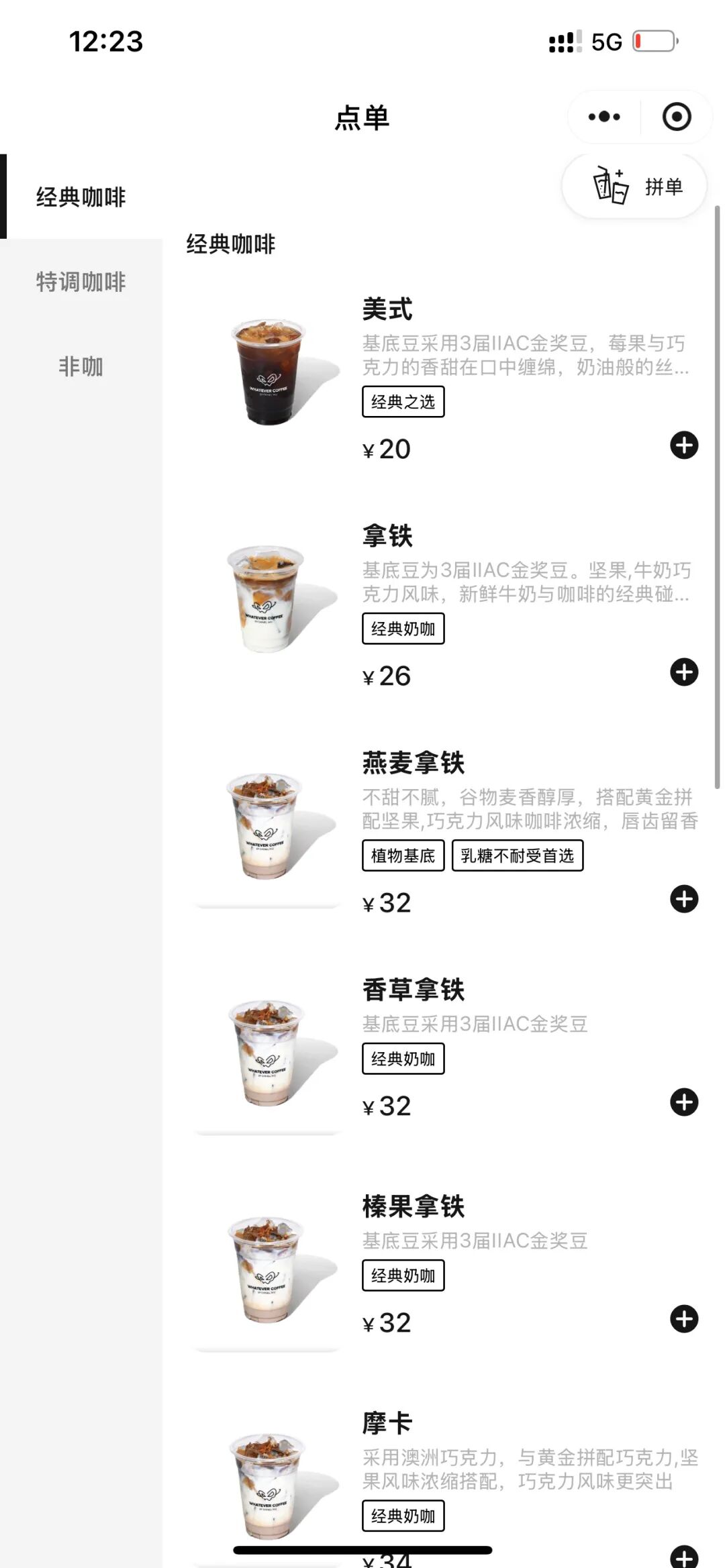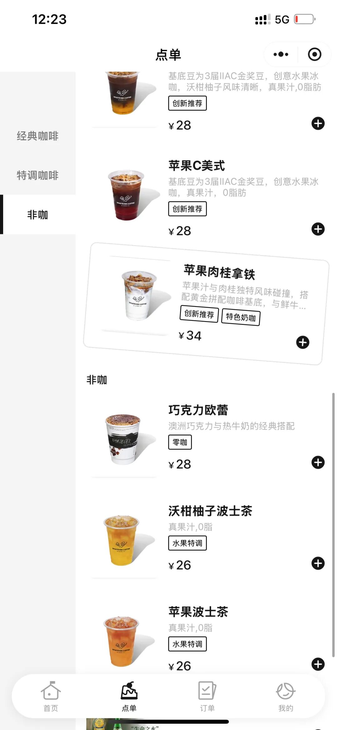 店内饮品价位在30元左右,这个价格略低于星巴克,却高于大多数连锁咖啡品牌。除经典美式、拿铁外,特调饮品“沃柑柚子茶美式”(水果冰咖,28元)、“苹果肉桂拿铁”(34元)这两款产品在传统咖啡的基础上加入了水果元素。同时门店还提供巧克力欧蕾(28元)、苹果波士茶(26元)等无咖啡因选项。