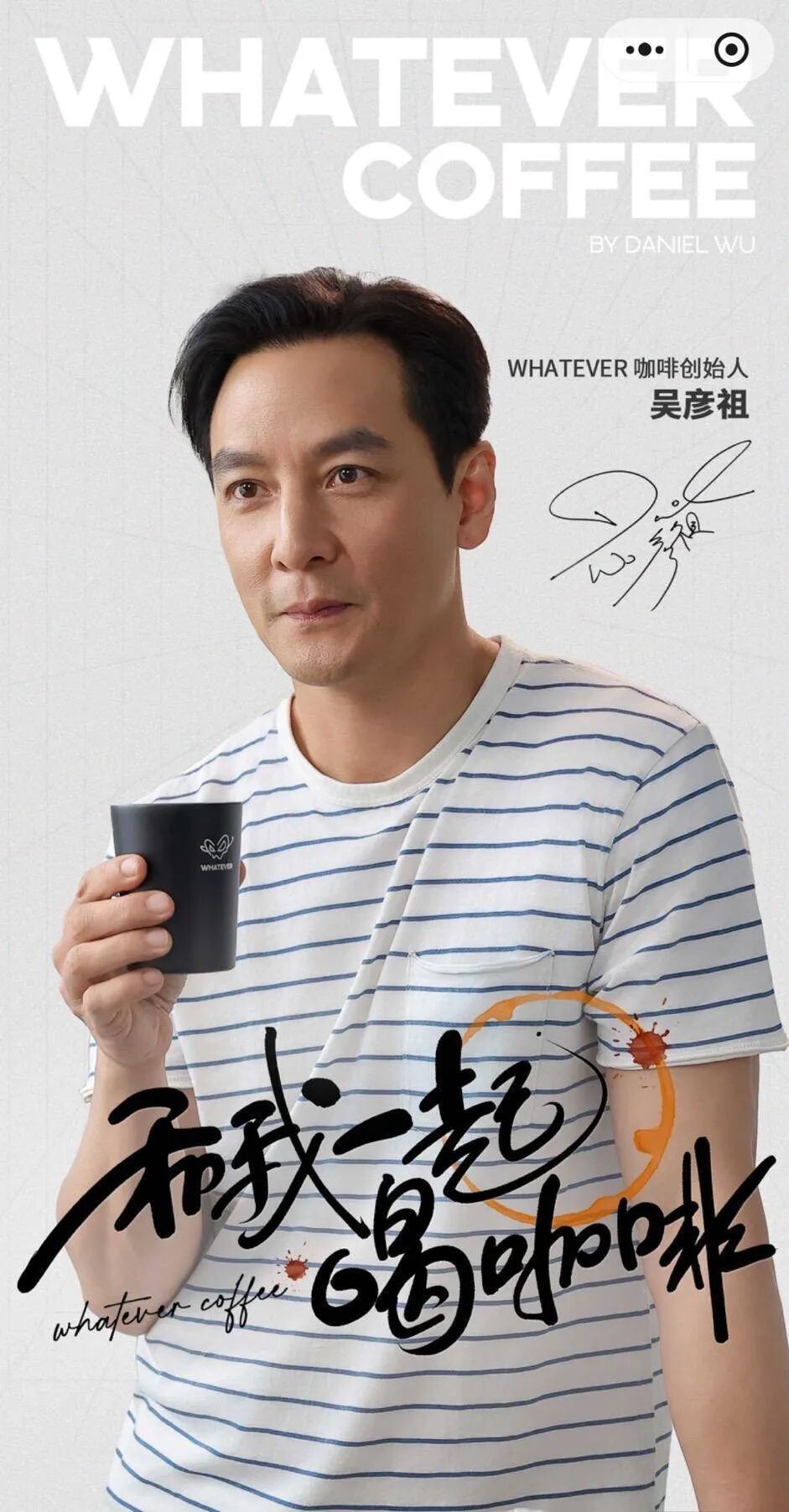 九派财经登录该品牌小程序时发现,开屏页面即被吴彦祖身着条纹T恤、手持黑色咖啡杯的极简海报占据,背景附有手写体品牌宣言:“无所谓,即有所畏。”点击进入“WHATEVER STORY”栏目,吴彦祖自述了其品牌理念:“一杯好的咖啡不仅能唤醒味蕾。更能激发灵感和创造力——这杯‘无所谓’,是我们与生活的和解。”
