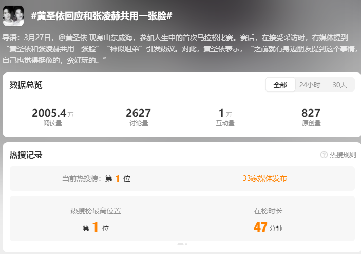 3月27日,黄圣依现身威海,参加人生中的首次马拉松比赛。赛后,在接受采访时,有媒体提到“黄圣依和张凌赫共用一张脸”“神似姐弟”引发热议。