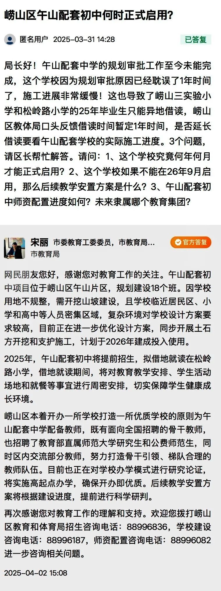 青岛日报/观海新闻4月3日讯 近日,市委教育工委委员,市教育局党组成员、副局长宋丽做客民生在线,与网民在线交流。