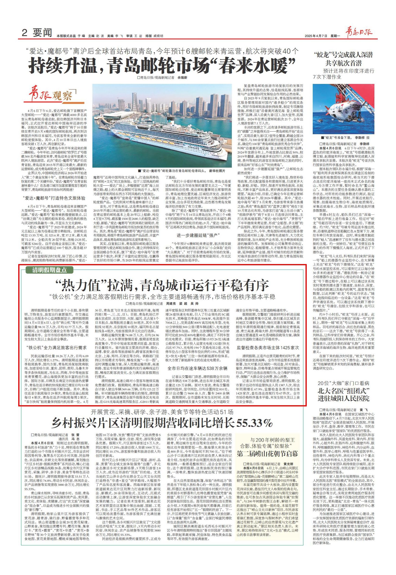 记者从交警部门获悉,清明假期全市日均在途车辆达538万余辆,进出东岸主城区车流总量达125万余辆。面对大客流,青岛交警提前研判组织,坚守岗位,日均设置岗位810处,累计出动警力9600余人次、警车2400余辆次。假期期间,全市道路未发生长时间、长距离道路交通拥堵及重大交通事故,全市道路交通安全形势平稳,主要道路畅通有序。