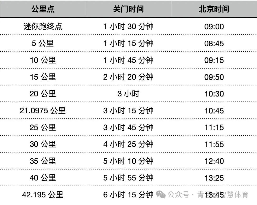 根据“青岛国际马拉松”微信公众号发布的2024青岛马拉松参赛信息,马拉松、半程马拉松、迷你跑均将设置关门时间(如上图)。若参赛选手在关门时间后还未到达相应公里点,需要停止比赛并退出赛道。退出的马拉松和半程马拉松项目参赛选手可乘坐收容车到达相应项目的终点。