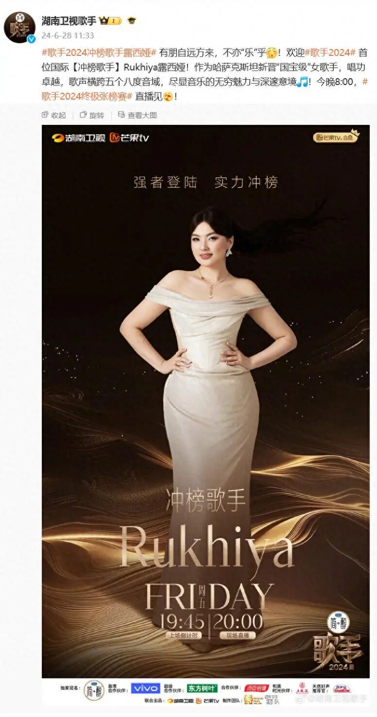 节目官博发文:“有朋自远方来,不亦‘乐’乎!欢迎《歌手2024》首位国际冲榜歌手Rukhiya露西娅!作为哈萨克斯坦新晋‘国宝级’女歌手,唱功卓越,歌声横跨五个八度音域,尽显音乐的无穷魅力与深邃意境!今晚8:00,《歌手2024终极张榜赛》直播见!”