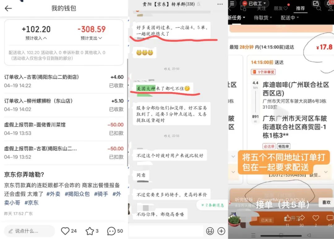 某平台配送时限过短、全职骑手数量不足、兼职骑手被区别对待,加上罚款严重,将不同地址非顺路多笔订单打包捆绑要求配送等问题,导致骑手不愿加入,延误问题高发,用户体验受损。如,有美团骑手表示,“美团大神来了都吃不住”。