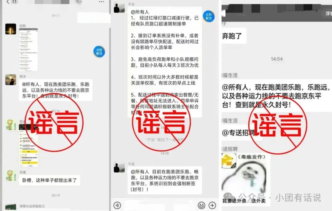 4月19日,小团查实并澄清安徽某人造谣“去其他平台跑单会被美团封号”,同时因发现有水军活动,表态不想参与个别平台的口水战。