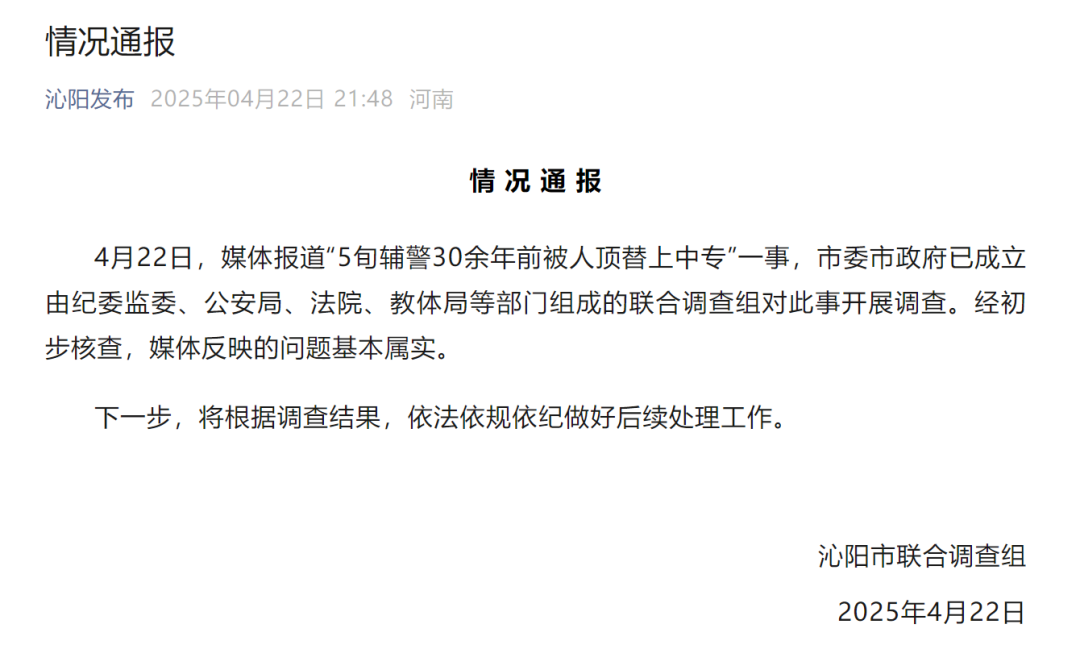 4月22日,媒体报道“5旬辅警30余年前被人顶替上中专”一事,市委市政府已成立由纪委监委、公安局、法院、教体局等部门组成的联合调查组对此事开展调查。经初步核查,媒体反映的问题基本属实。