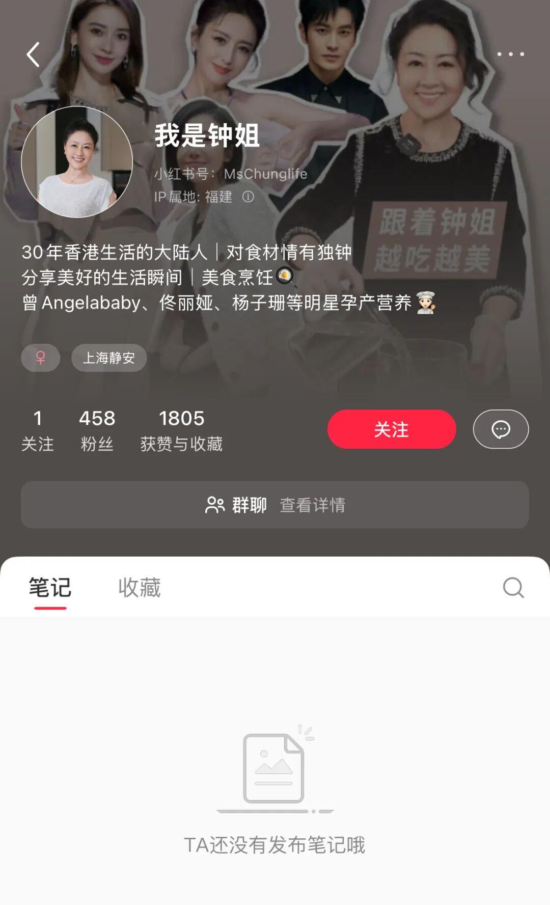 “我是钟姐”的账号拥有458粉丝,其个人简介写道:“曾Angelababy、佟丽娅、杨子姗等明星孕产营养”。