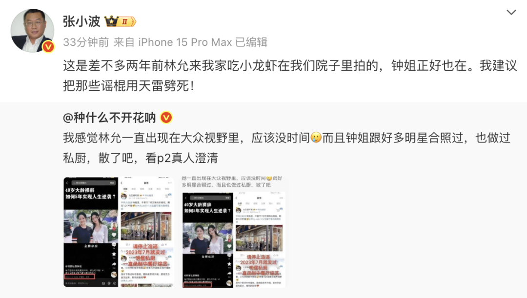 随后,北京凤凰联动文化总裁张小波发文回应:“这是两年前林允来他家吃龙虾时候拍的照片,并没有怀孕,当时钟姐也在。”