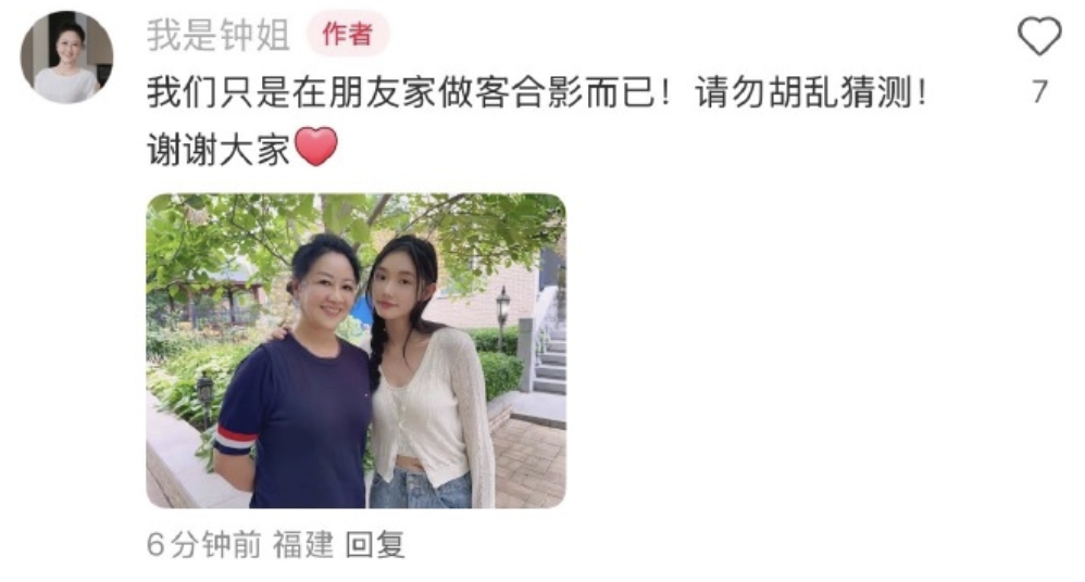有网友发现“我是钟姐”在该贴下方回复网友评论:“我们只是在朋友家做客合影而已!请勿胡乱猜测!谢谢大家。”