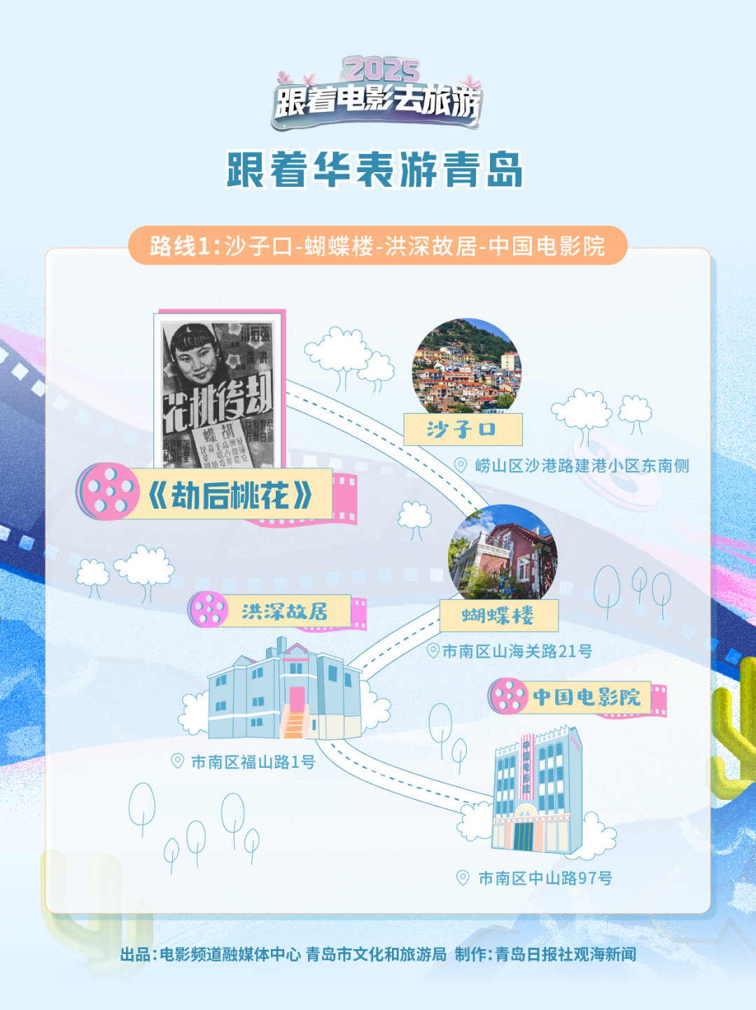 这条以《劫后桃花》为中心展开的路线,带领我们去往洪深故居、蝴蝶楼等影片主创曾经居住的地方。第一站沙子口,层层叠叠的红房子依山而建;山海关路21号的粉色小洋楼——“蝴蝶楼”,堪称八大关建筑艺术的精华;在福山路1号的洪深故居,名篇《我的“失地”》蜕变为佳片《劫后桃花》,成就中国现实主义电影的开山代表作之一;最后一站是张石川导演创建的山东大戏院(现中国电影院),百年马赛克墙面、民国售票窗仍在诉说着光影传奇。