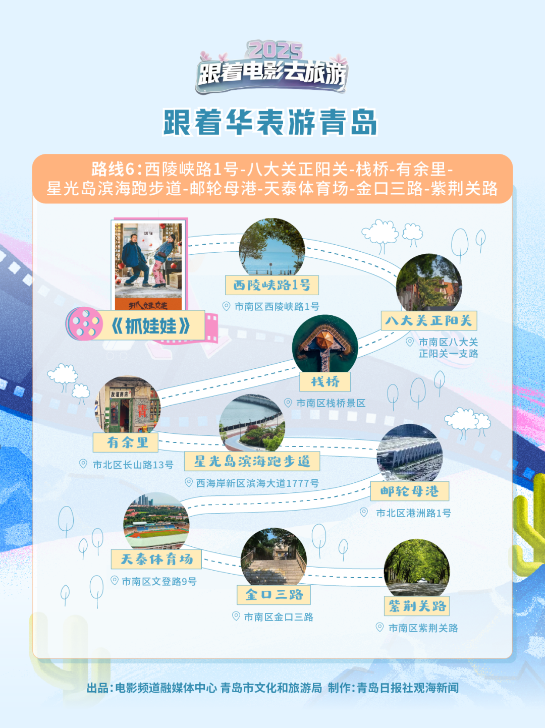 在这条满是《抓娃娃》元素的路线中,西陵峡路一号,马继业得知能成为运动员时奔跑的身影还历历在目;正阳关的小路上,马成钢“父爱如山体滑坡”的爆笑场景让人忍俊不禁;青岛栈桥的转角,就是马继业上学的必经之路;充满烟火气的有余里小院,则完美复刻了老青岛的生活图景;星光岛环岛跑道,见证了马继业梦想成真的高光时刻;邮轮母港的“还得捞”更是贡献了全片最爆笑的桥段;天泰体育场的水瓶倒影里,藏着最温馨的家庭时光;别忘了金口三路的猫咪阶梯和那条通往大海的“西虹市”最美林荫路,都是电影留给我们的治愈系彩蛋。
