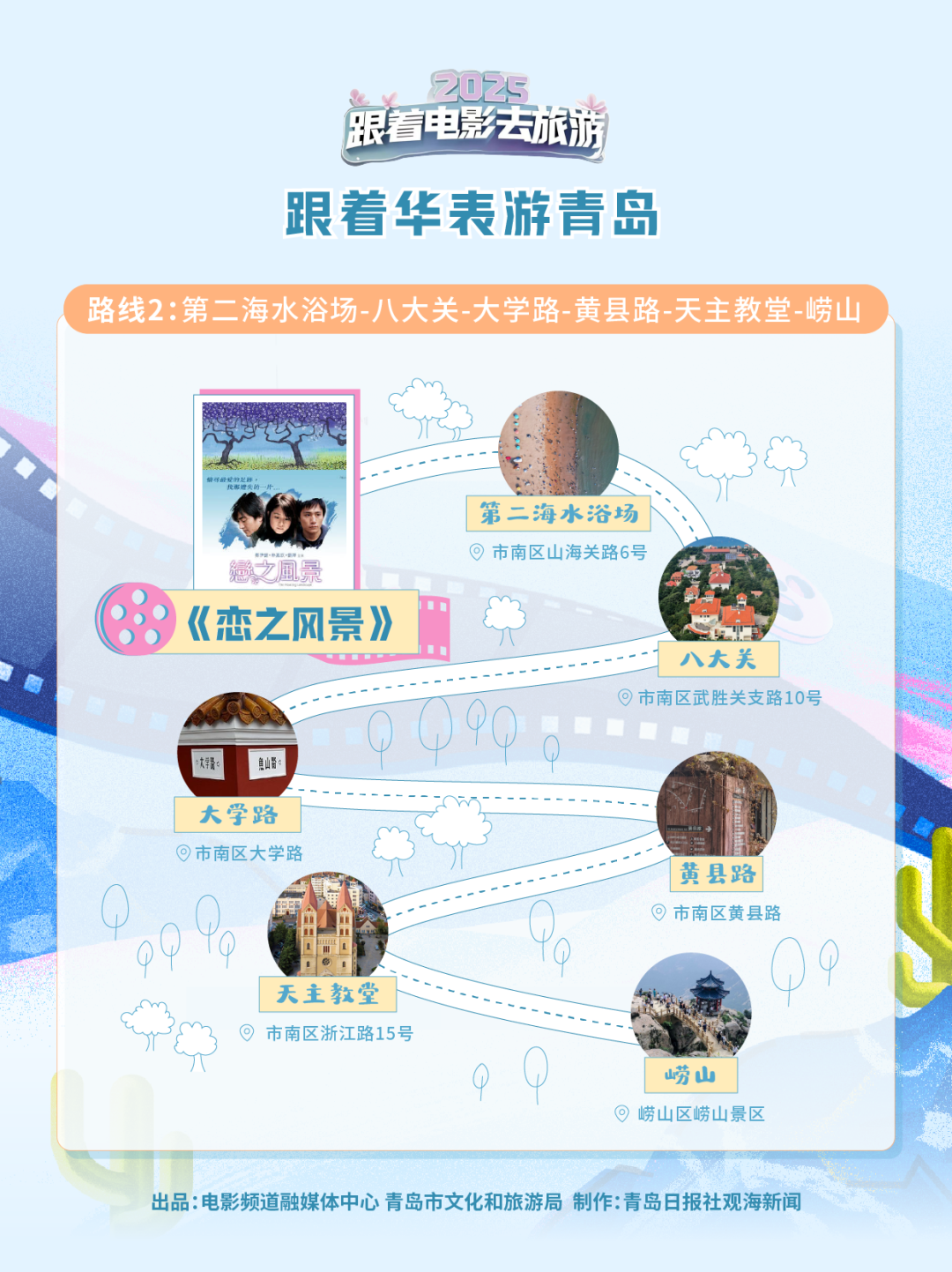 这条围绕《恋之风景》展开的路线,带领我们去往青岛第二海水浴场、八大关、黄县路、大学路等经典青岛旅游景点。片中,冬季的第二海水浴场见证了主角的邂逅,而春天这里的湛蓝海水、细软沙滩更显温柔,尽展北方海滨风情;沿着海岸漫步,来到八大关,红瓦绿树、碧海蓝天,每一步都仿佛走进老电影的胶片里;转角遇见大学路,这条不足两公里的文艺街道,藏着名人故居、文创小店,处处弥漫着浪漫与诗意。而黄县路的石阶与梧桐,则勾勒出青岛最温柔的紫色系风景;浙江路15号的教堂,双塔静静矗立,诉说着青岛的百年故事;主角曼儿寻找的“登瀛梨雪”——崂山巨峰脚下万树梨花如雪,正是“花里有人家”的诗意写照。
