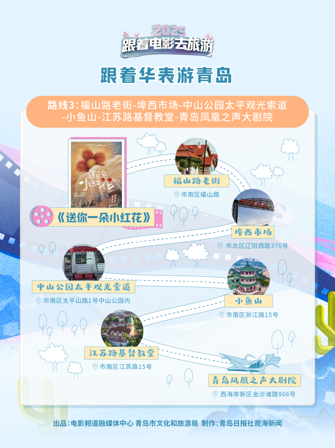 在这条由《送你一朵小红花》延展的路线中,我们可以跟着韦一航和马小远的足迹,走过福山路老街、市北区埠西市场、太平山观光索道等城市景观。从韦一航的家,市南区福山路老街到烟火气十足的市北区埠西广场;从中山公园的太平山观光索道到江苏路的基督教堂,这些老青岛街区承载了百年青岛的历史。而坐落于西海岸新区的青岛凤凰之声大剧院,则展现了现代青岛的摩登与时尚。