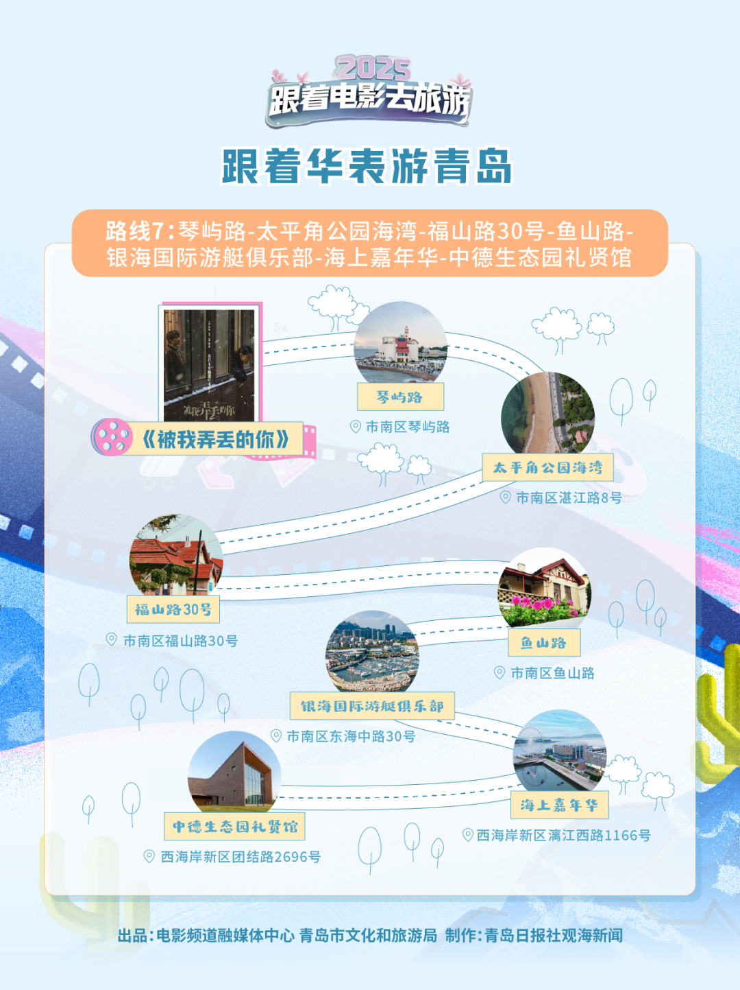 市南区琴屿路,檀健次饰演的白晓宇骑着单车,海风轻拂,衣角吹动;在市南区太平角公园海湾,可以复刻白晓宇和王斤斤同款拍照姿势;站在市南区银海国际游艇俱乐部的海岸,海风携着浪花,仿佛能听见他们恋爱的故事;在西海岸新区海上嘉年华,则可以欣赏充满现代感的海湾风景——碧海蓝湾中,临海而建的大型摩天轮格外耀眼。
