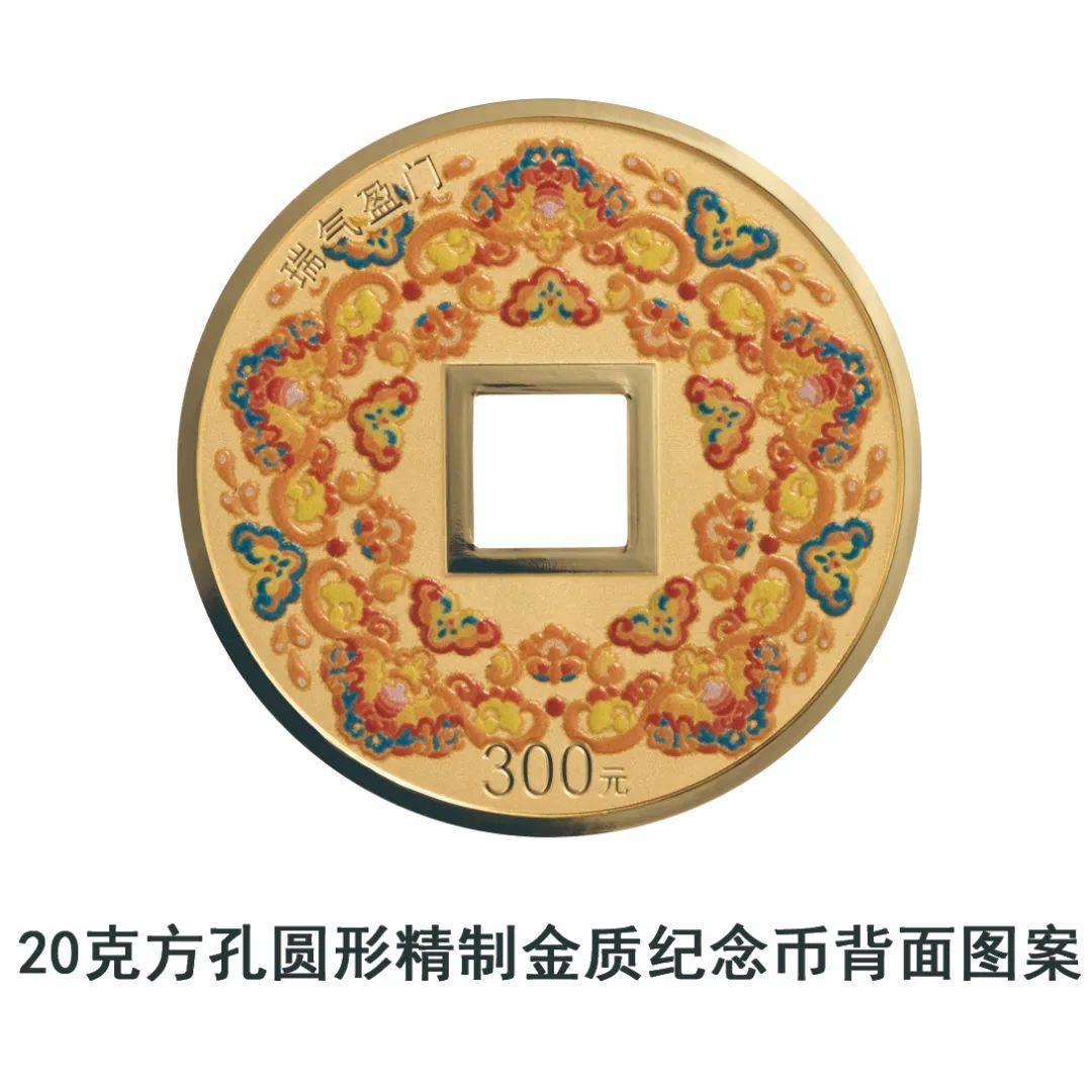 20克方孔圆形金质纪念币为精制币,含纯金20克,直径30毫米,内孔6毫米×6毫米,面额300元,成色99.9%,最大发行量2000枚。