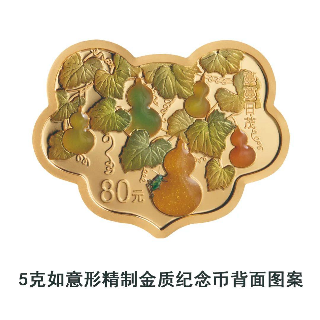 5克如意形金质“蔓蔓日茂”纪念币背面图案为葫芦、藤蔓、蝈蝈等装饰组合设计,并刊“蔓蔓日茂”字样及面额。