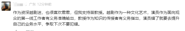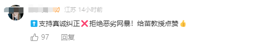 苗怀明表示,还有人专门写了一篇文章论《陈丽君对宝玉的解读无误》,“看这篇文章的评论,可以看到明白人还是有许多。反向捧杀的同时,暴露了自己的无知。本来没多大的事情,书没读清楚可以再多读,话说错了承认错误提升自己就好了,没必要强行洗白,更不能网暴他人。对事情的判断缺乏常识、不讲逻辑、没有是非观念,这样的饭圈文化令人痛心。”