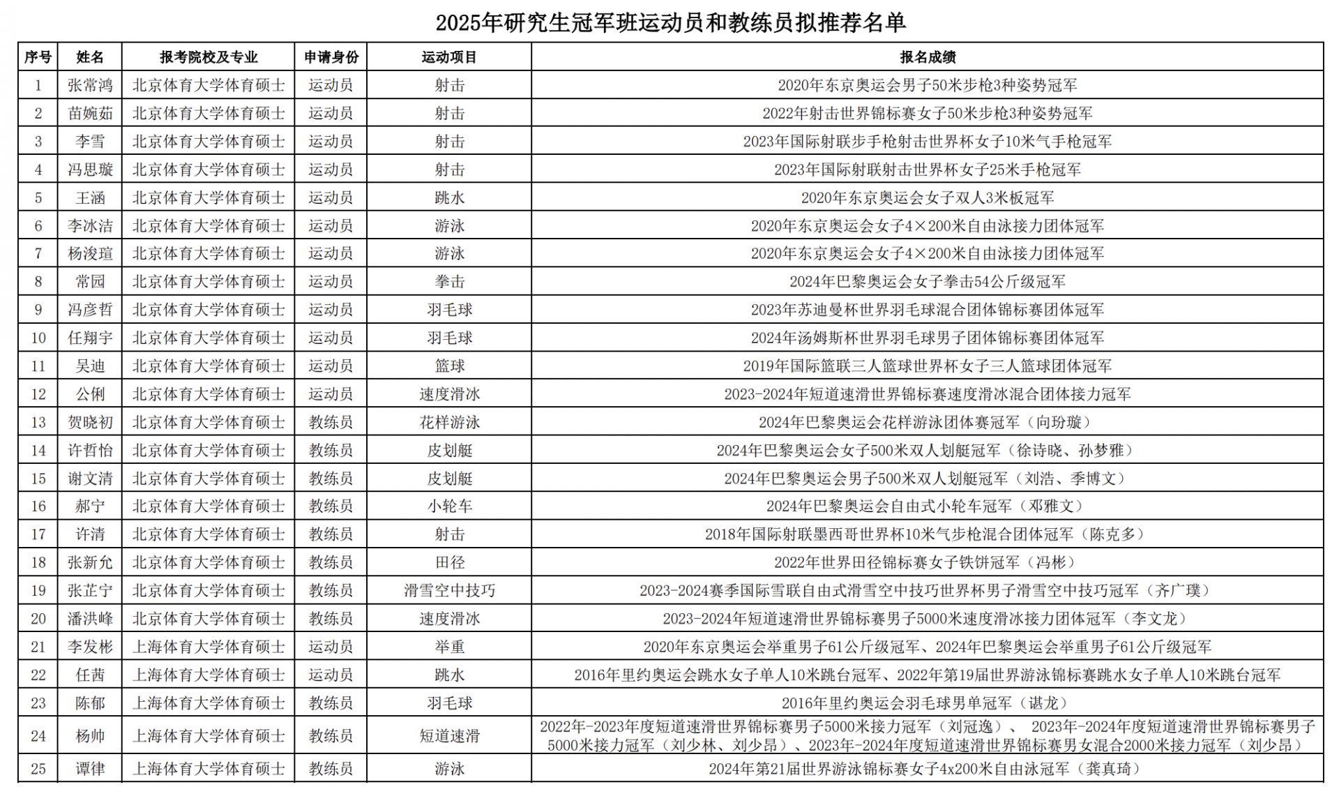 依据教育部有关规定,北京体育大学、上海体育大学组织招收优秀运动员和教练员免初试攻读体育专业硕士学位研究生(简称研究生冠军班)工作,经审核,拟推荐25名优秀运动员和教练员免初试攻读2025年研究生冠军班,现对拟推荐名单进行公示。