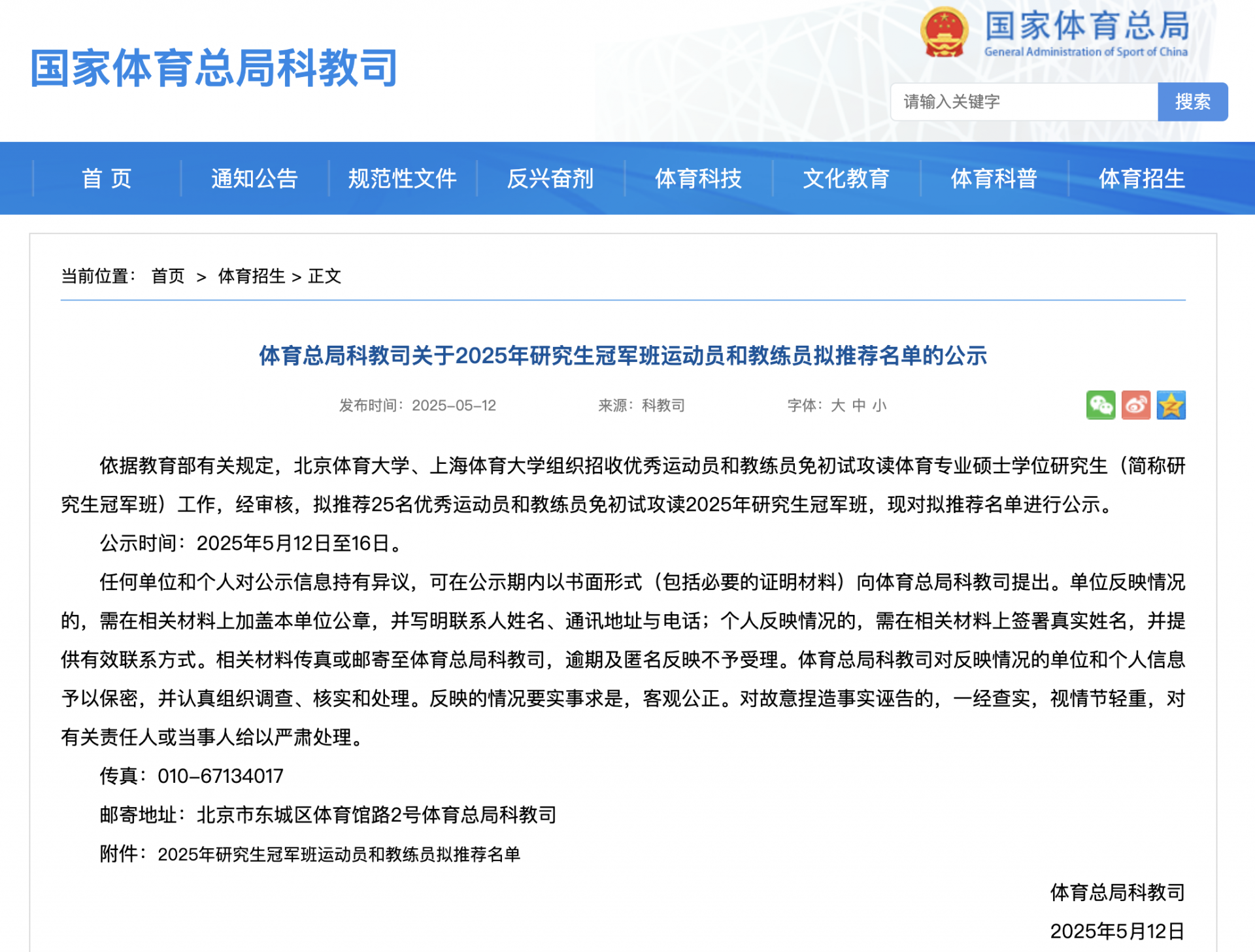 5月12日,国家体育总局科教司发布《体育总局科教司关于2025年研究生冠军班运动员和教练员拟推荐名单的公示》。
