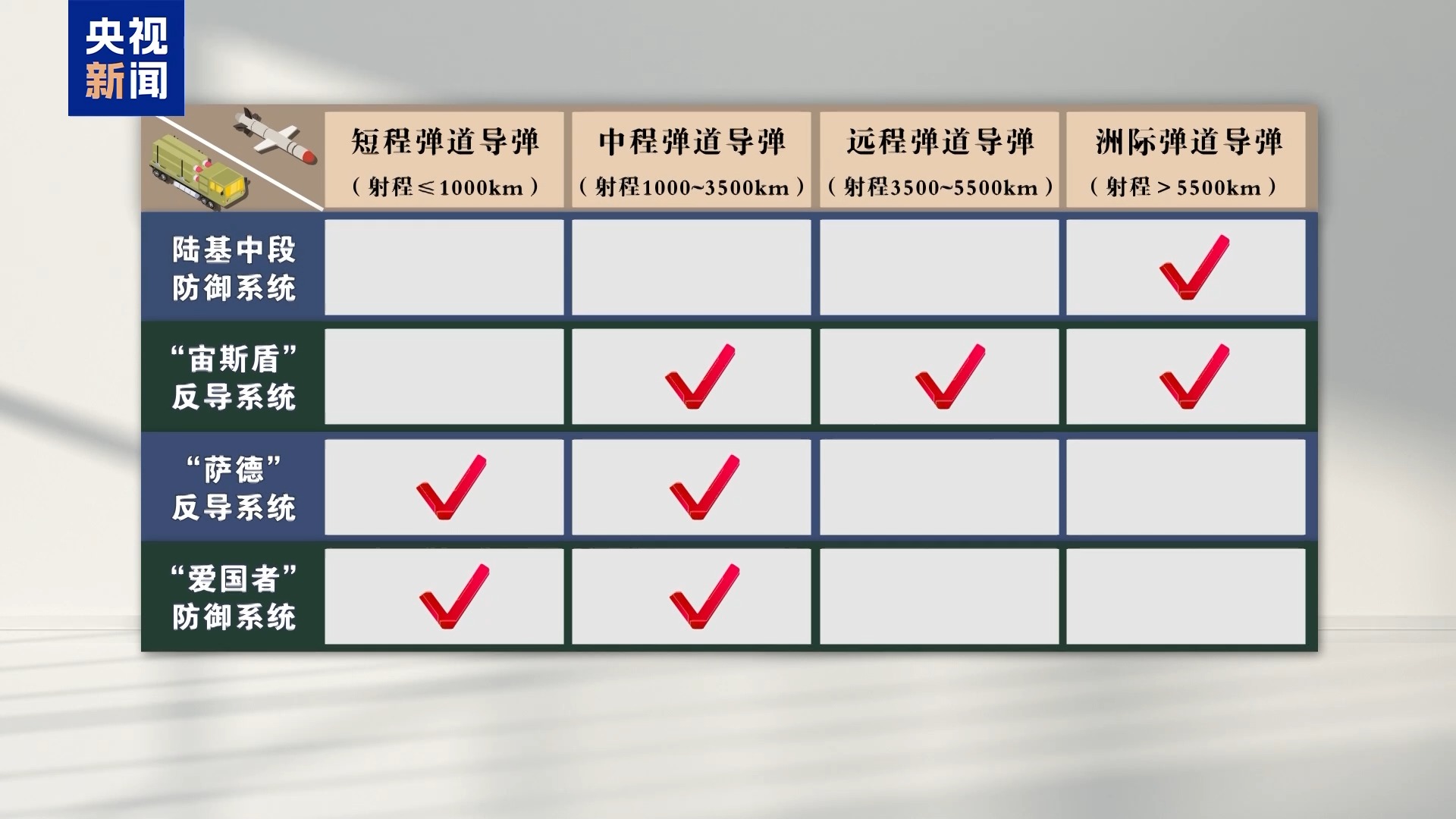 美国的导弹防御系统针对的主要是弹道导弹,按照射程,分为短程(射程小于等于1000公里)、中程(射程1000-3500公里)、远程(射程3500-5500公里)和洲际弹道导弹(射程大于5500公里)。