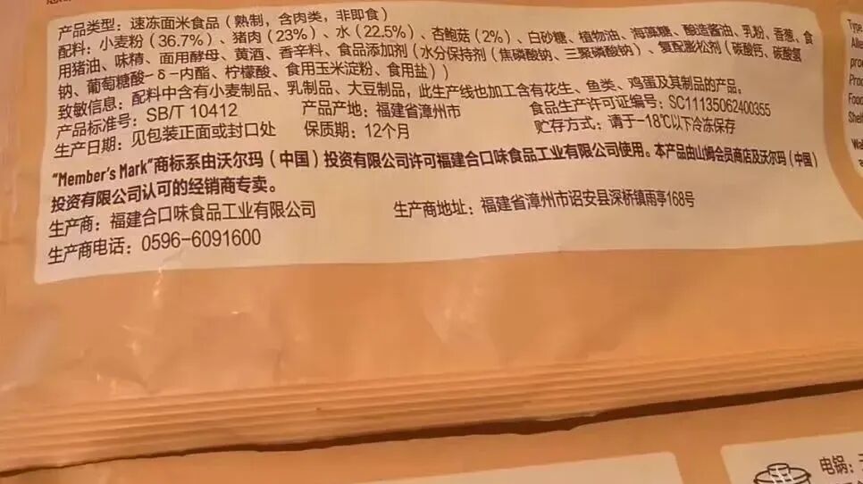 该产品包装显示,“馅料饱满,纯手工包制”,此外,产品说明提到,“本产品由山姆会员店及沃尔玛(中国)投资有限公司认可的经销商专卖”。