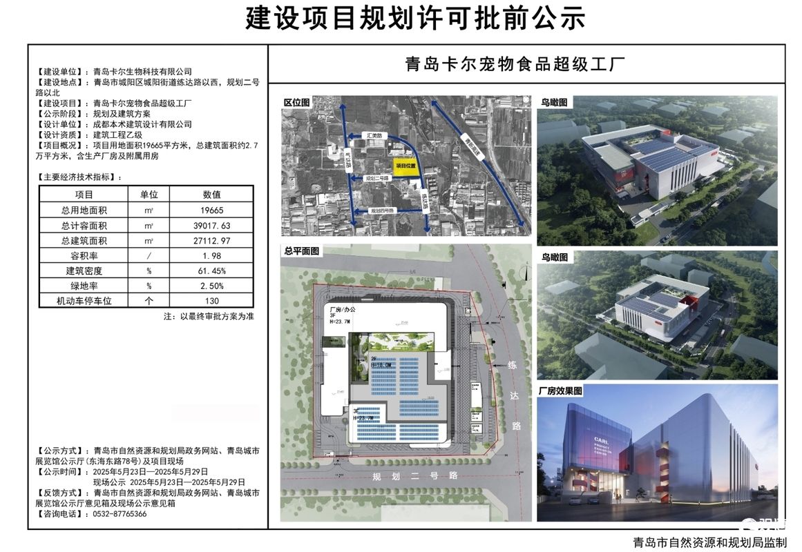 青岛日报社/观海新闻5月23日讯 今天,青岛卡尔宠物食品超级工厂项目批前公示,项目位于青岛市城阳区城阳街道练达路以西,规划二号路以北,由青岛卡尔生物科技有限公司负责建设。