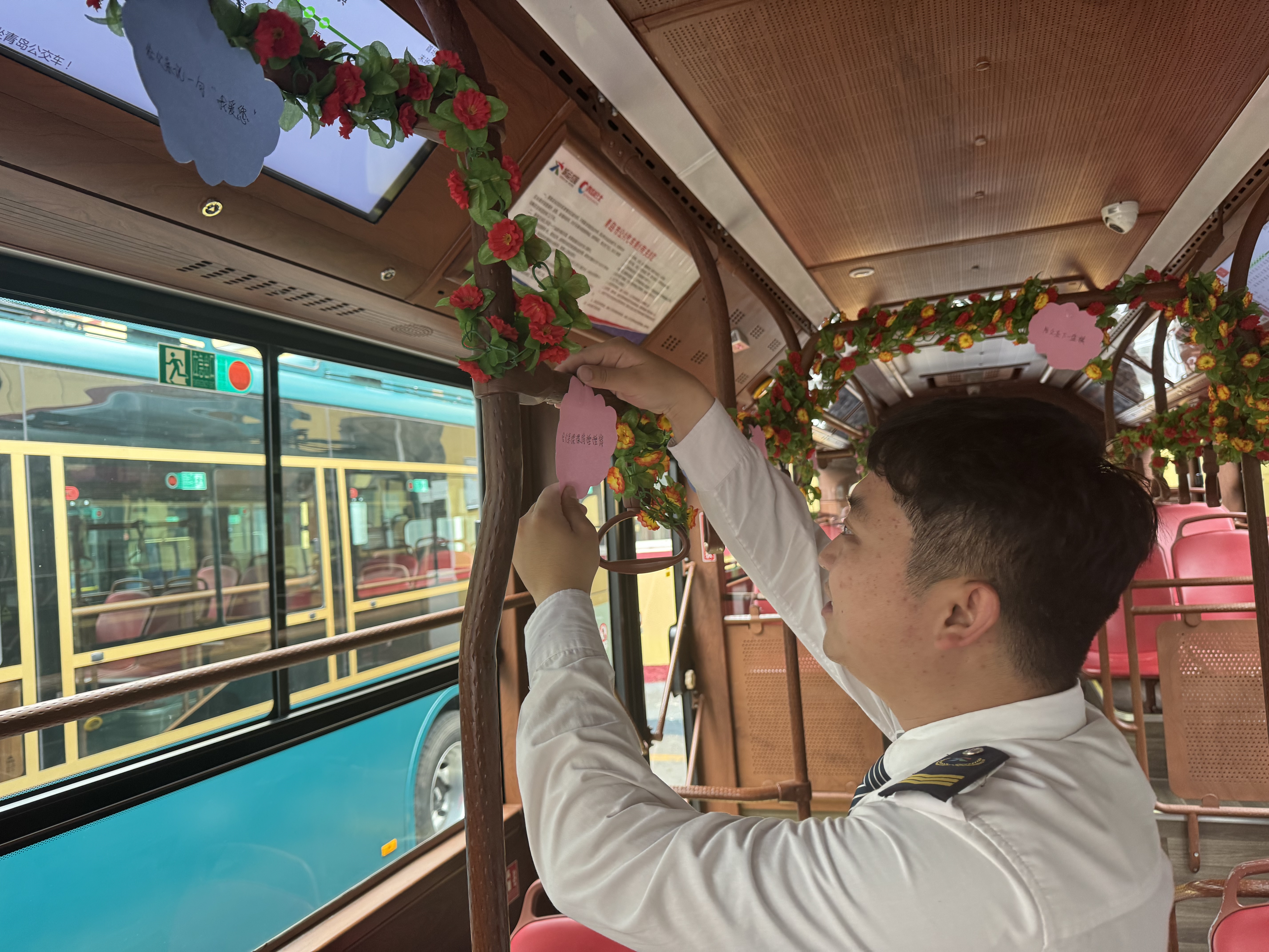 126路线的主题车厢更是别出心裁,车内悬挂着“父爱如山 温暖如风”“爸气十足”等创意拉旗,引得不少乘客驻足拍照。一位带着孩子乘车的白女士说:“这样的布置很有仪式感,让孩子懂得感恩父亲。”