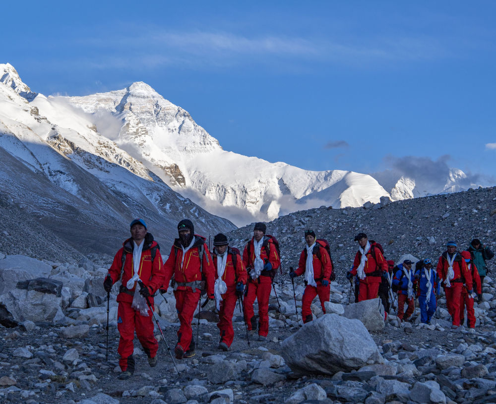 ↑5月28日,2020珠峰高程测量登山队队员在返回大本营途中。新华社记者 孙非 摄